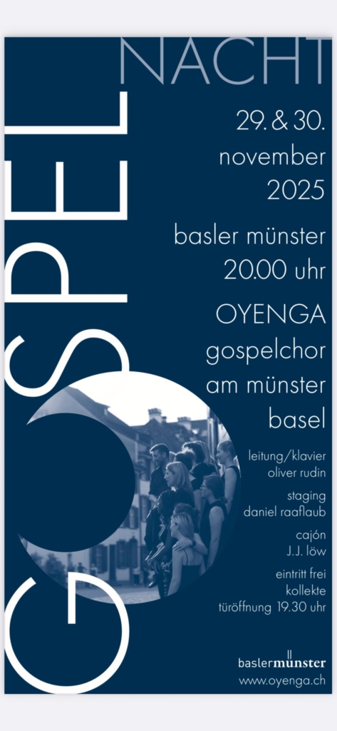 Cathedral (Münster) Basel / 8pm – The traditional “Gospel Night” of the OYENGA Choir Basel takes place at Münster Basel. Daniel is responsible for the choreography and the lighting. In addition, he is involved in the concept development together with Oliver Rudin.